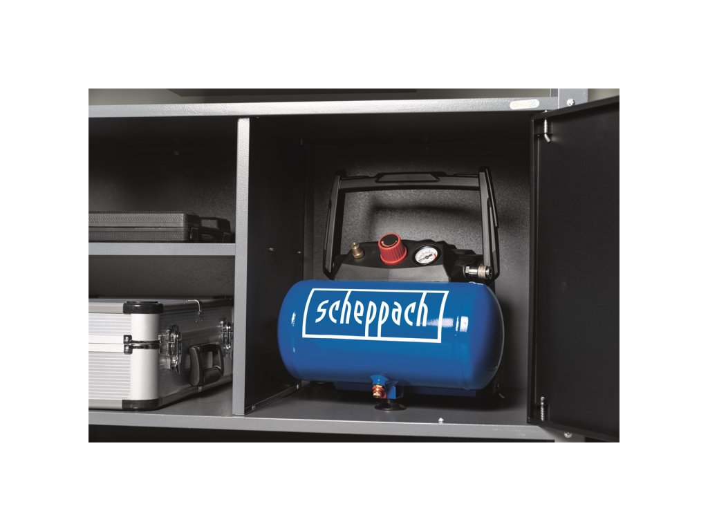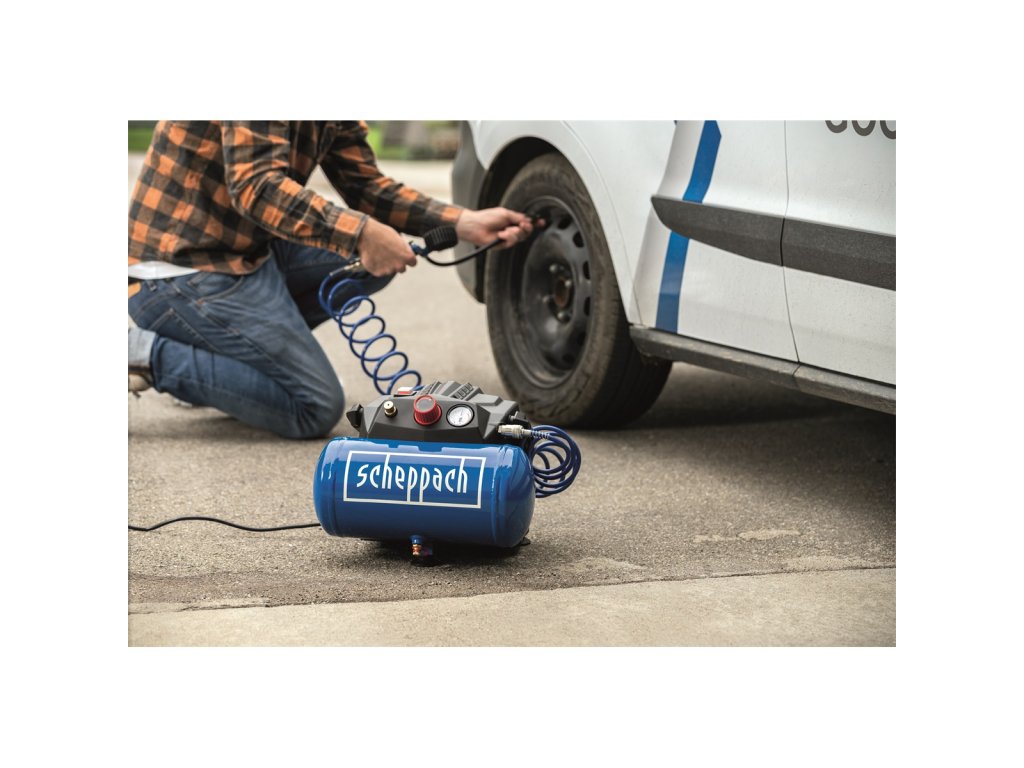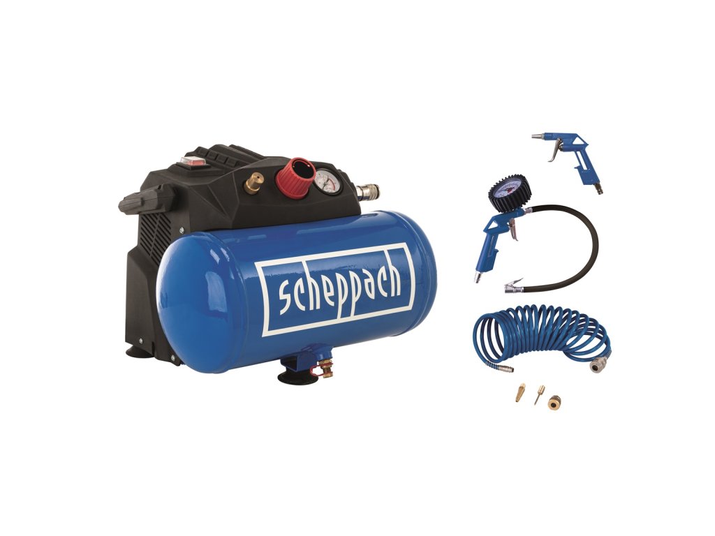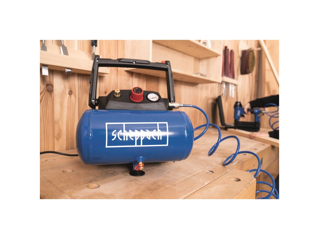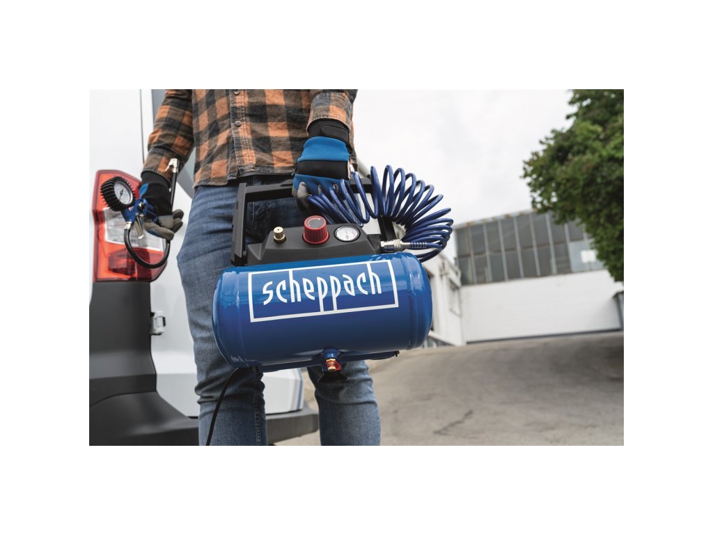 Scheppach HC 06 je praktický, lehký a snadno přenosný kompresor s tlakovou nádobou o objemu 6 l a silným motorem 1200 W. Díky vzdušníku se kompresor hodí nejenom na běžné nafukování pneumatik, míčů, matrací, jízdních kol, ale můžete k němu připojit i sponkovačku, stříkací pistoli (air brush), ofukovací pistoli apod.